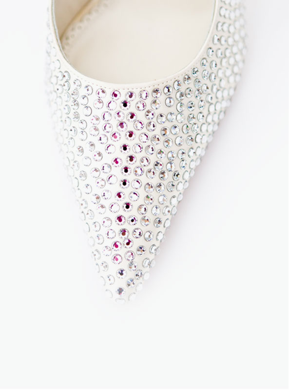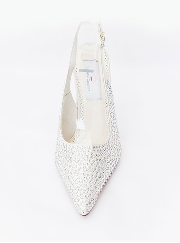 Pointed Cinderella sparkly slingback heels made from the finest ivory satin and real Italian leather soles. The pointed shoes are embellished with Swarovski crystals. Perfect bridal shoes designed with a 3.5 inch heel for all day comfort.