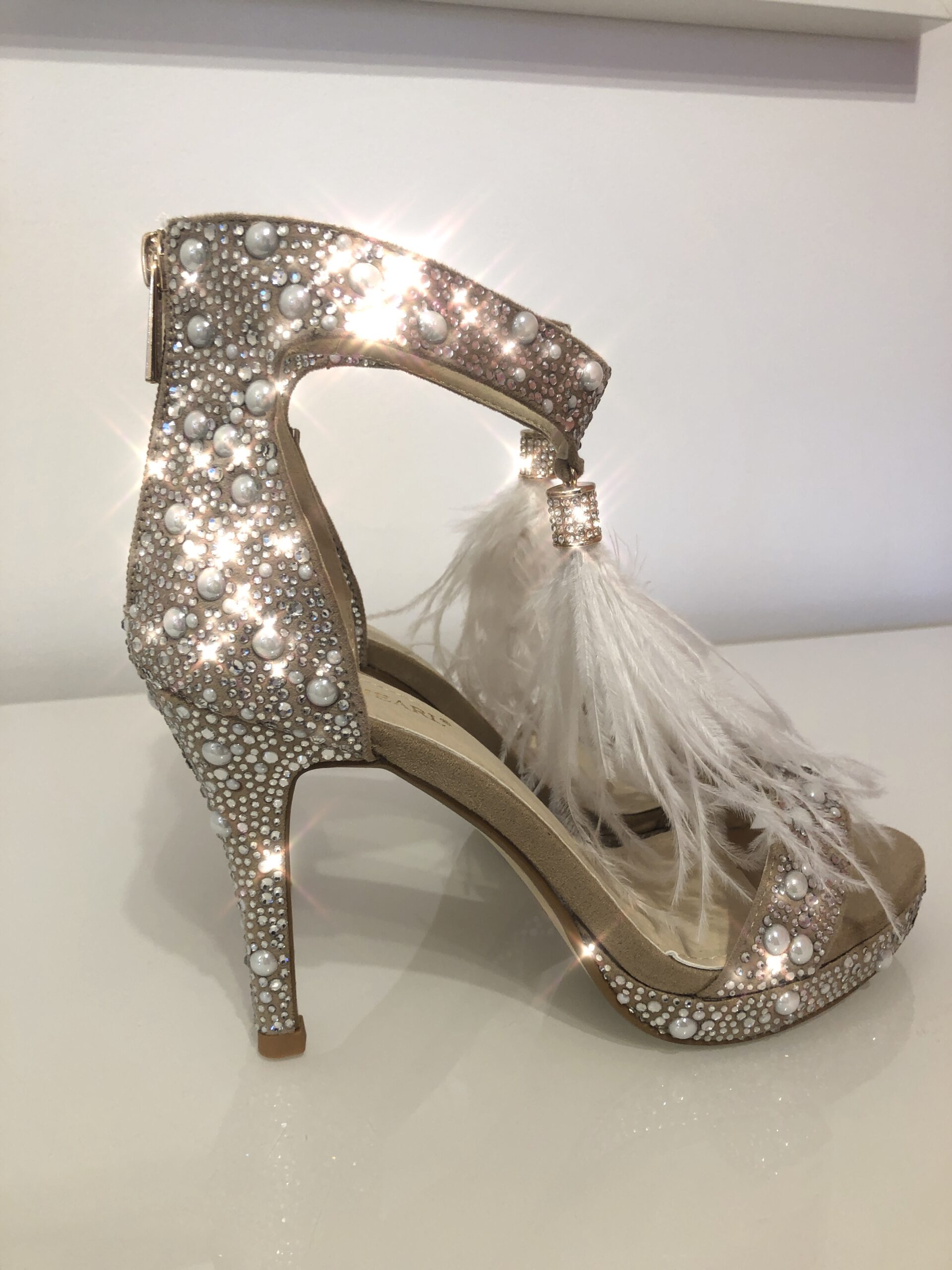 These sandals are stunning made with suede material with white crystal embellishments and the feather tassel detail.