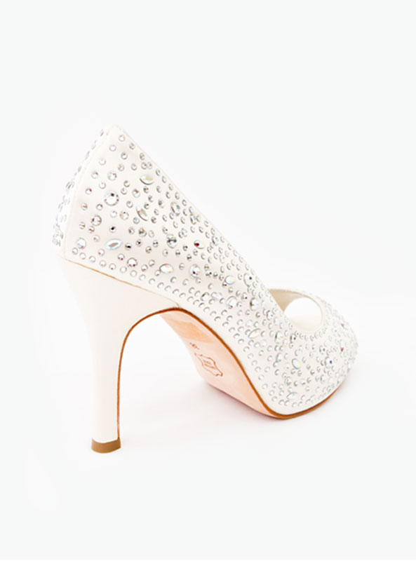 Elegant crystal peep-toe heels made from the finest ivory satin and real Italian leather soles. The round peep-toe heels are embellished with Swarovski crystals. Perfect bridal shoes designed with a 3.5 inch heel for all day comfort.