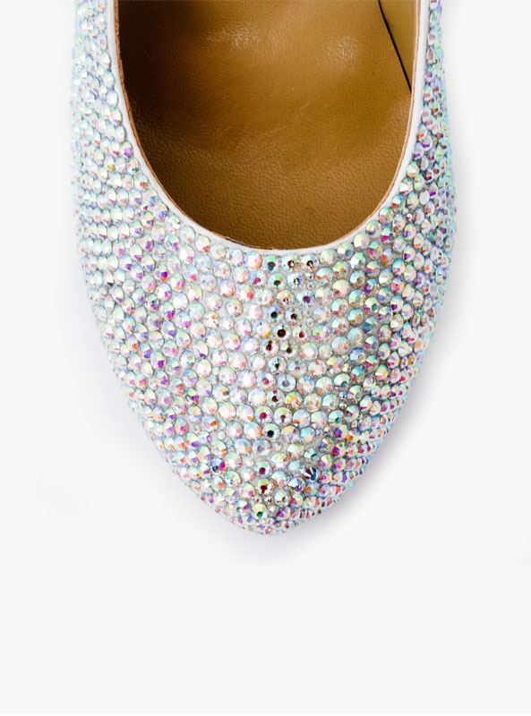 Crystal platform almond toe heels. Shoes available in silver or black with a pearlescent crystal finish made with AB crystals. The silver and black crystal shoes come with a hot pink sole. This page displays the shoe in silver with pearlescent crystals and a hot pink sole.