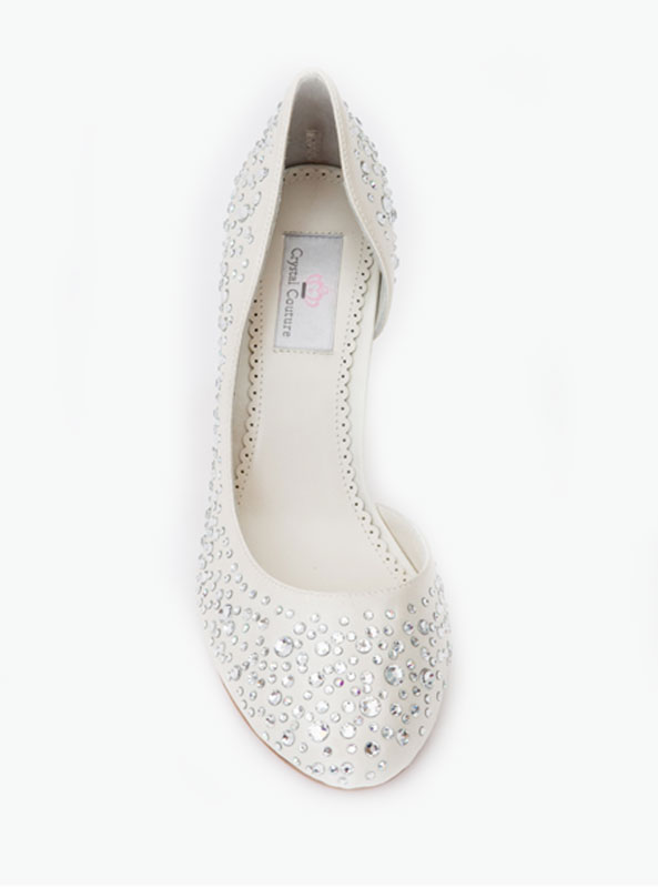 High society cutaway heels made from the finest ivory satin and real Italian leather soles. The round toe shoes are embellished with Swarovski crystals. Perfect bridal shoes designed with a 3 inch heel for all day comfort.