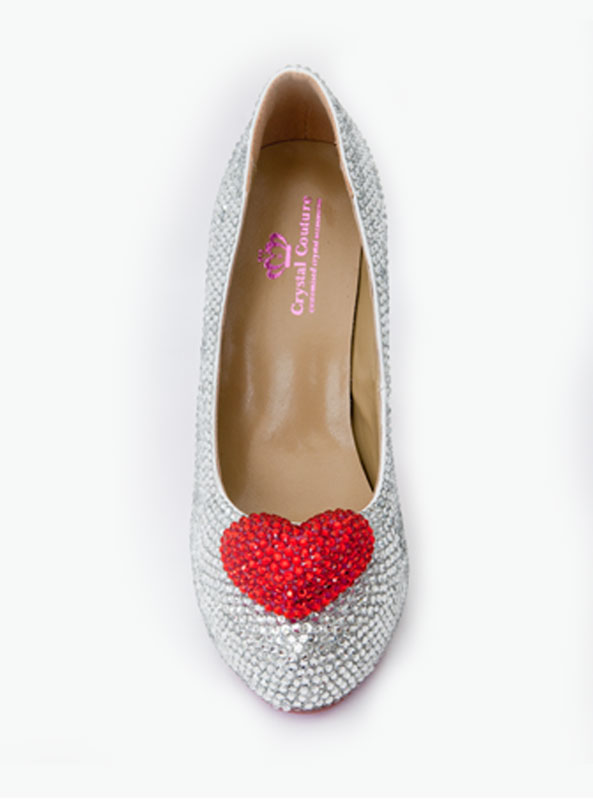 Gorgeous red heart crystal closed toe shoes. The shoes are embellished with silver and red diamante crystals and the heels have crystallised soles.