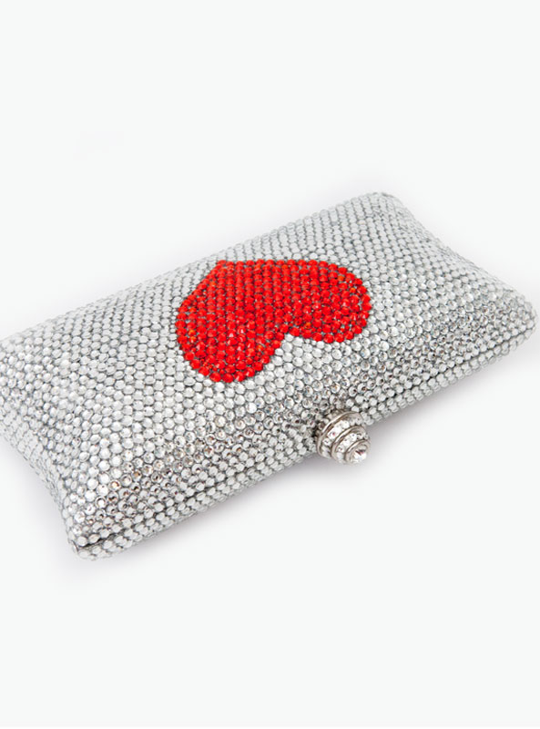 Gorgeous red heart crystal rectangle clutch bag. The clutch bag is embellished with silver and red diamante crystals and comes with a chain strap to wear over the shoulder.